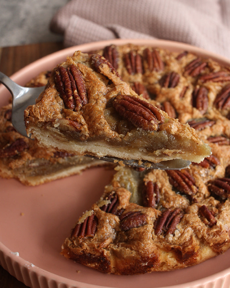 - Toothsome butterscotch over a buttery shortbread. Topped with roasted pecans