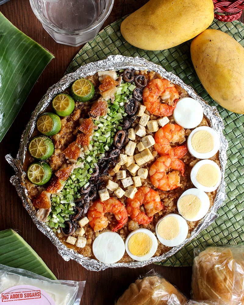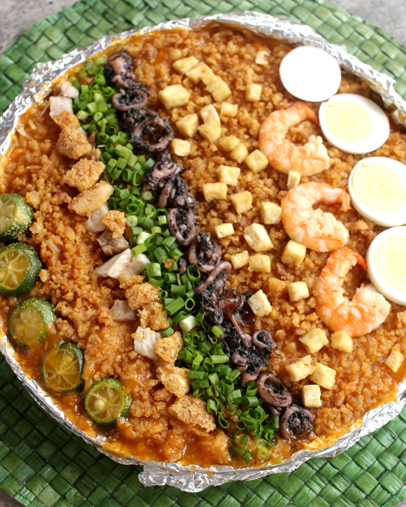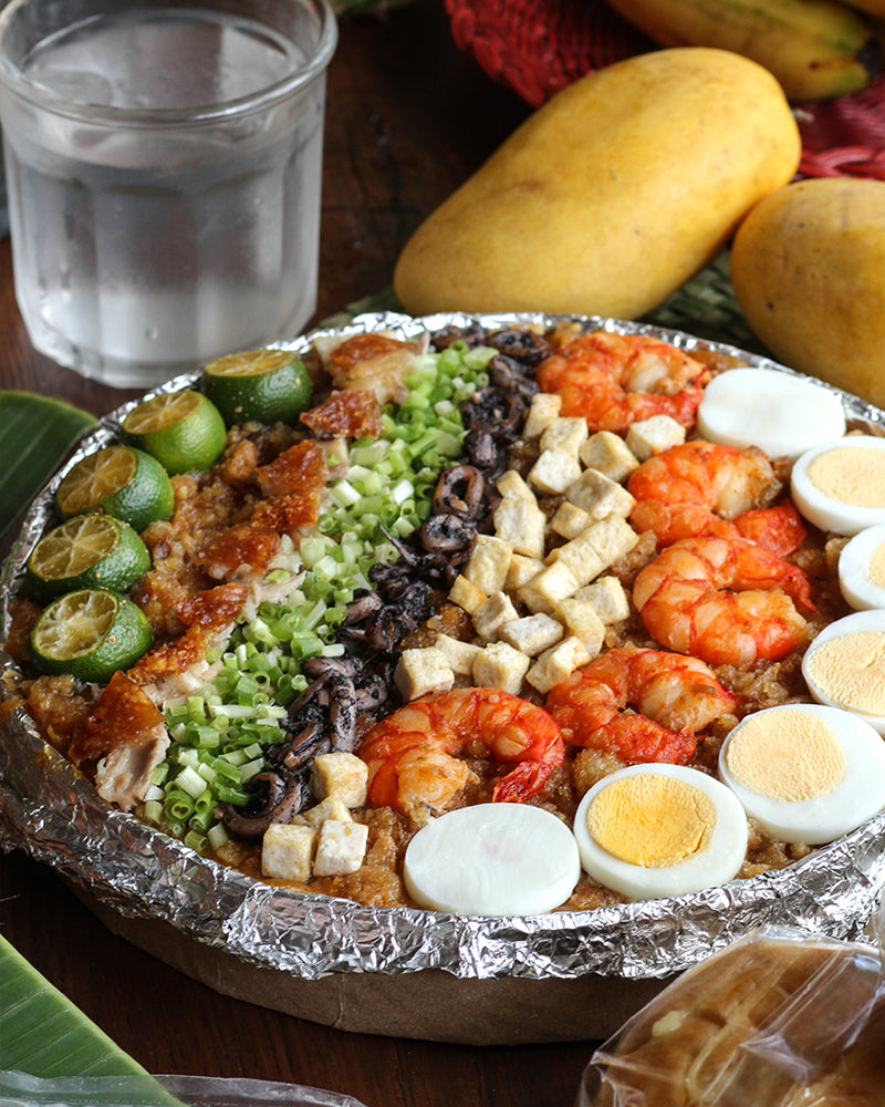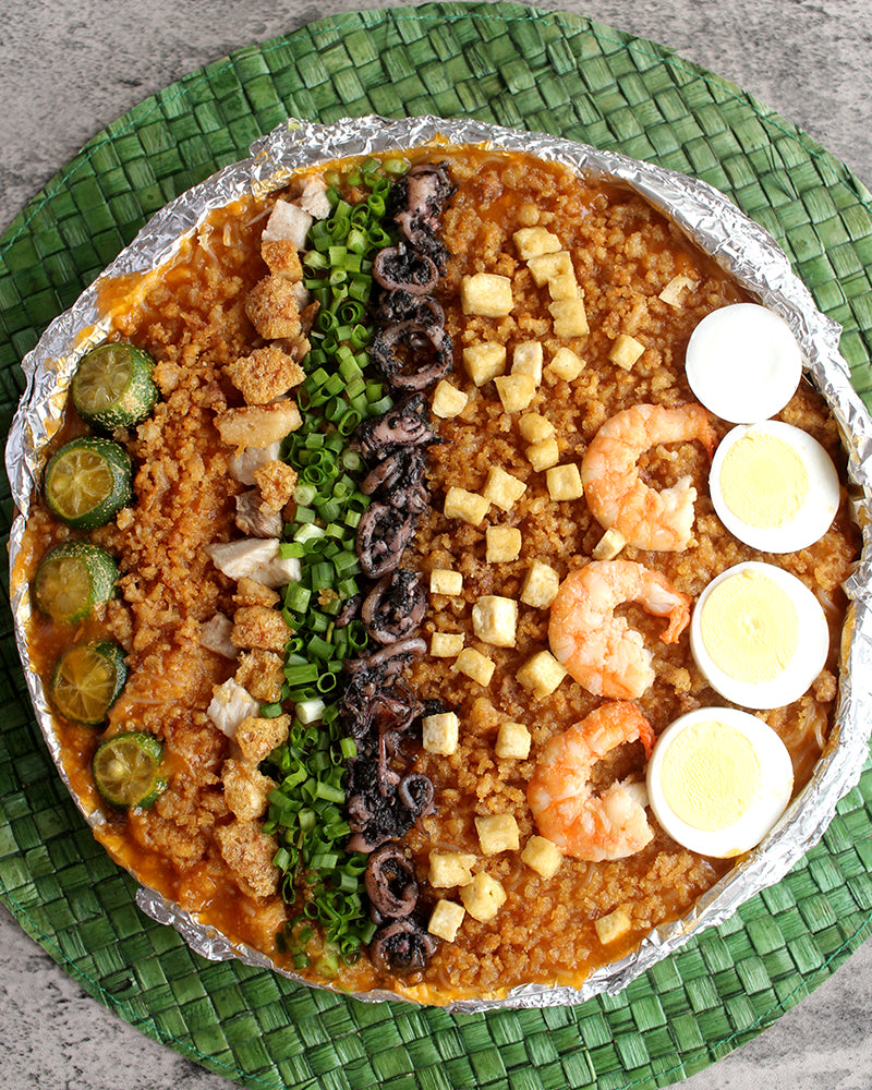 - Regular Palabok contains shrimp, chicharon, eggs, and chives