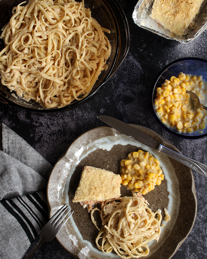 In case you needed help in planning a menu: Benedicto Kitchen perfectly pairs their famous baked salmon and crabmeat pasta and then adds creamed corn on the side as a side. This bundle is composed of the following: