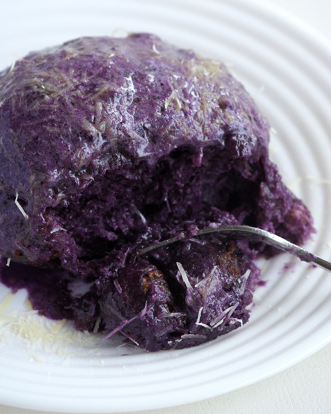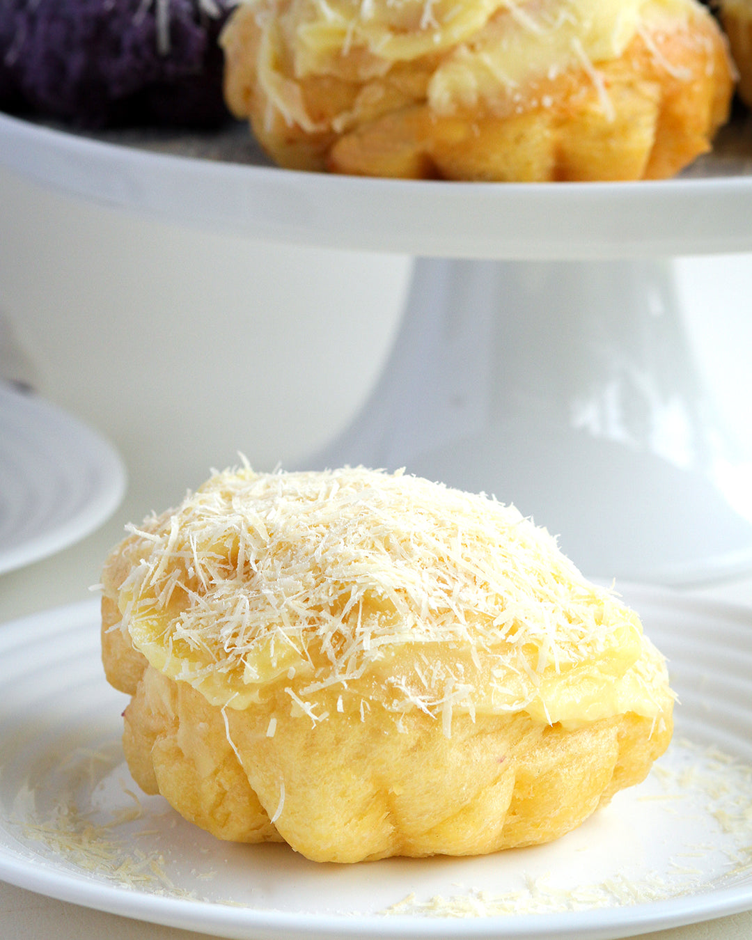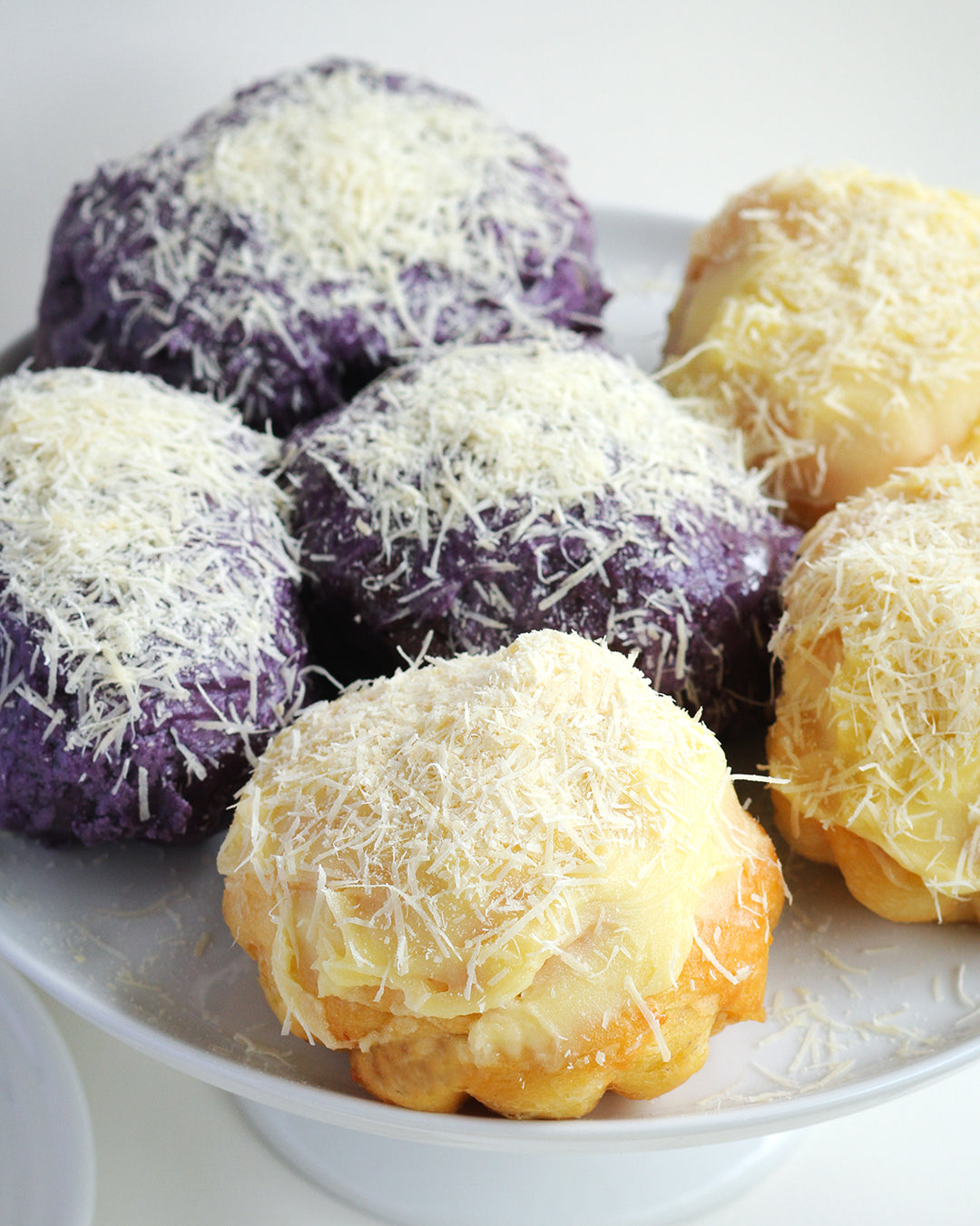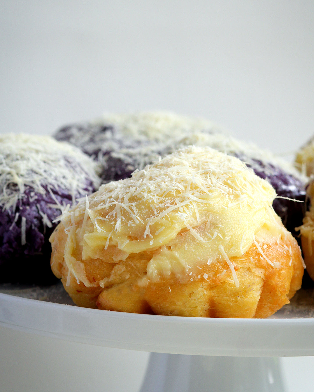 Ube Ensaymada - Ensaymada infused with ube halaya, topped with a layer of homemade buttery ube halaya then finished with an ube sweet creamy French butter and a generous amount of Queso de bola