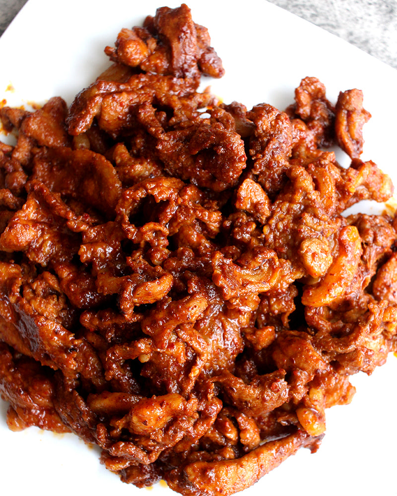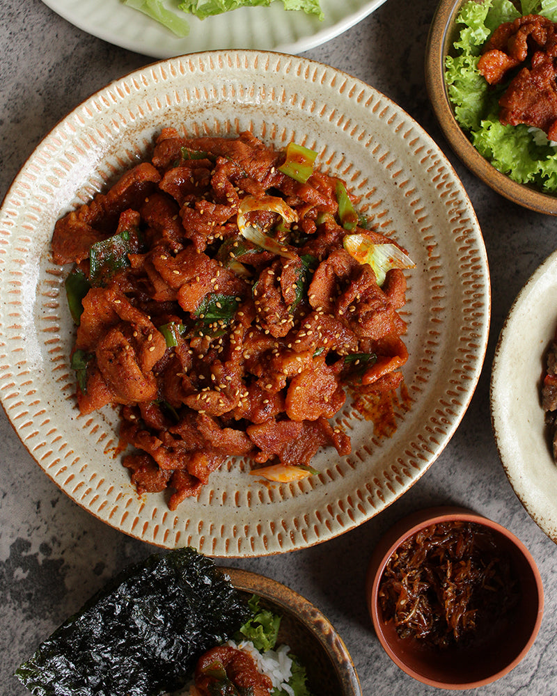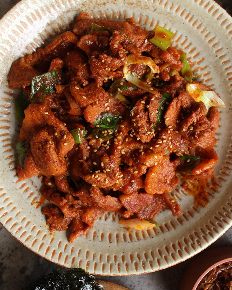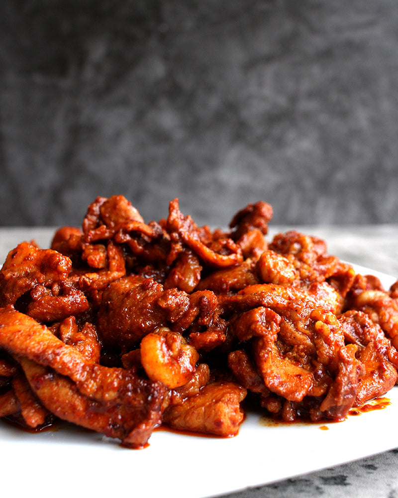 • Spicy marinated pork belly, thinly sliced. Good for Korean BBQ. Contains chilis.