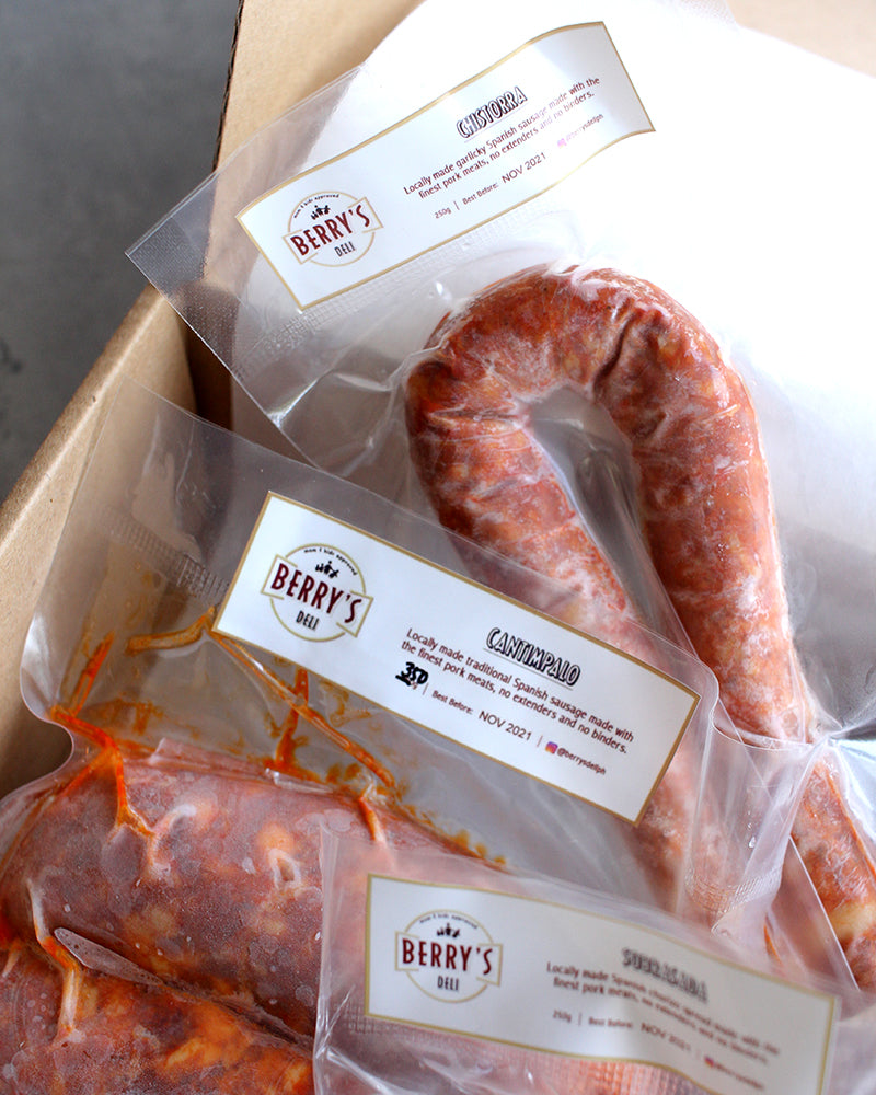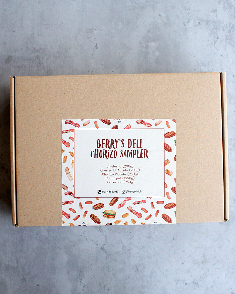 - Chorizo Sampler includes Chistorra (250g), El Abuelo (250g), Picante (250g), Sobrasada (250g), and Cantimpalo (350g)