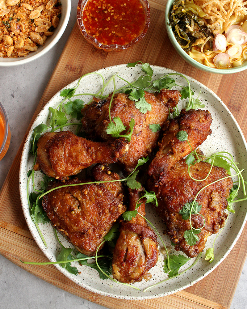 - Cooking suggestion: Thaw chicken fully. Preheat cooking oil for deep-frying. Coat chicken in cornstarch, shake off excess. Once the oil is hot (when bubbles form upon dipping wooden spoon), add chicken in batches and fry until golden brown. Best when served, topped with crispy garlic and shallots
