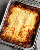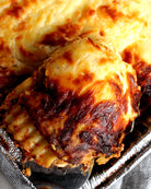 - Layers of al dente noodles with savory meat sauce made with ground beef and pork, cheesy bechemel, and topped with mozzarella cheese