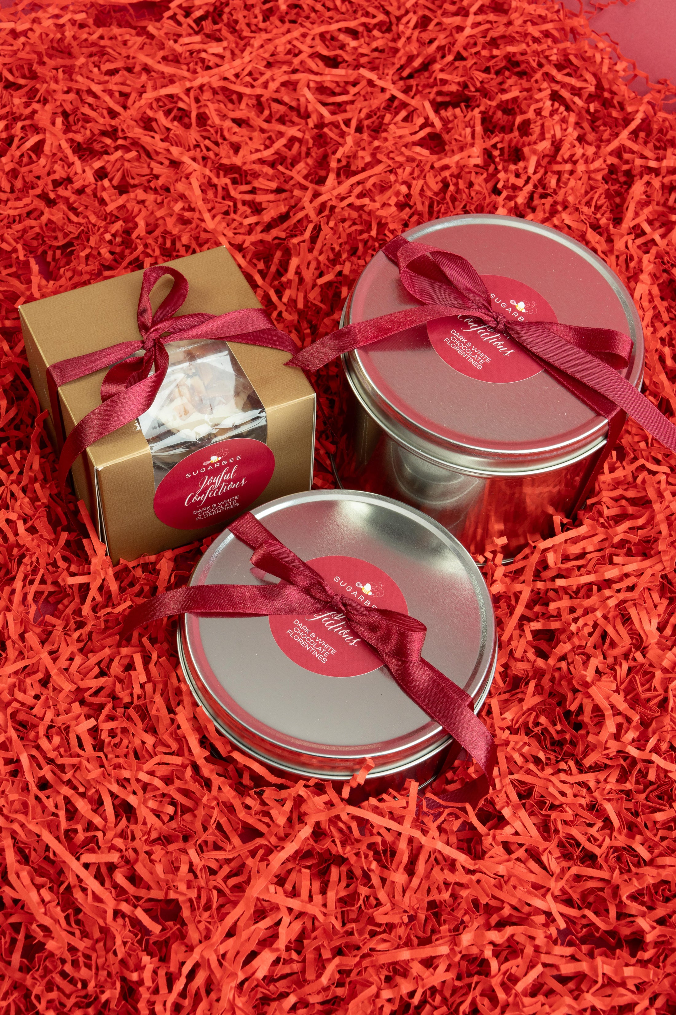 White Chocolate Florentines: white milk chocolate, dried cranberries, almonds, caramel praline