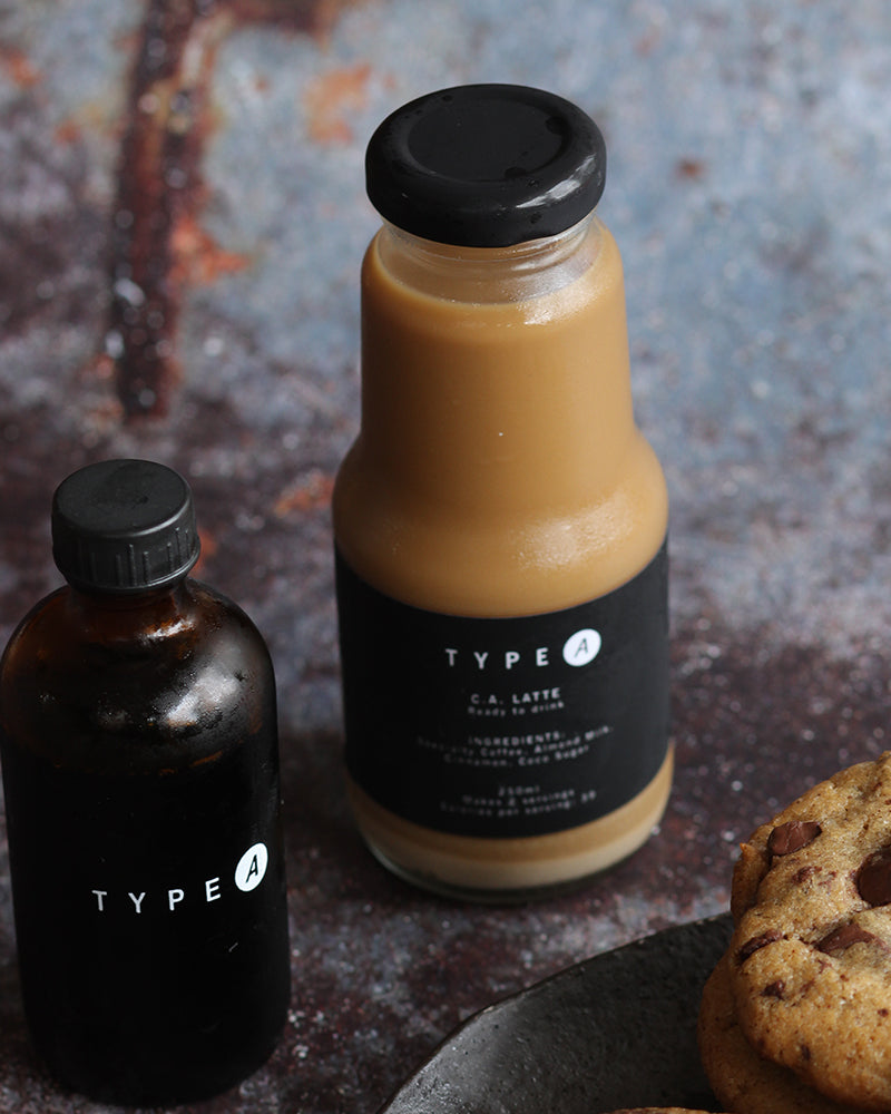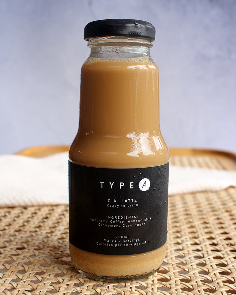 - 2 long servings of Type A's best-selling cinnamon almond latte in a 250 ml glass bottle
