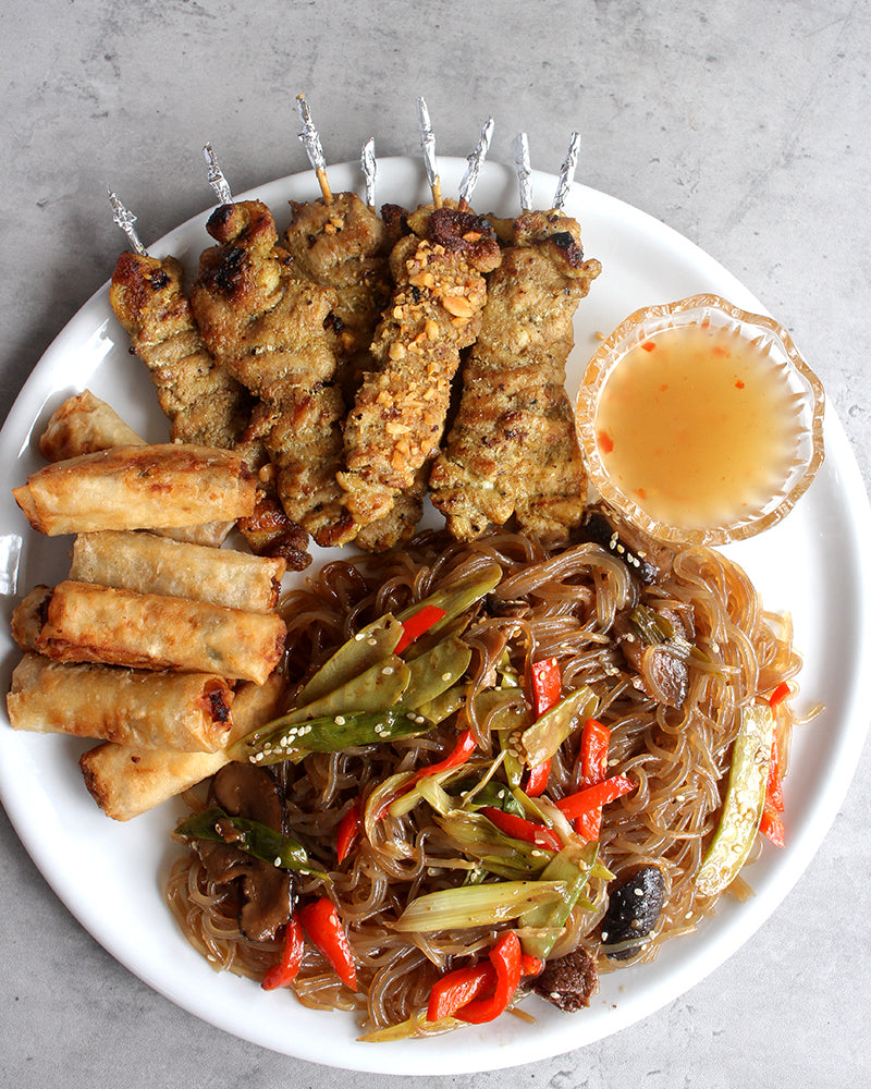 - The Asian Favorites Celebration Bundle includes: 1 tub Korean Chap Chae, 10 sticks Indonesian Pork Satay, 10 Crunchy Smoked Fish & Red Egg Rolls with Thai Chilli Sauce